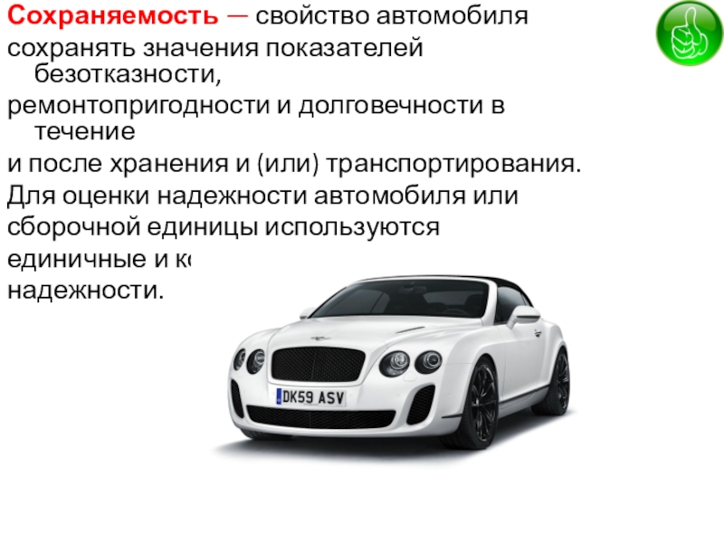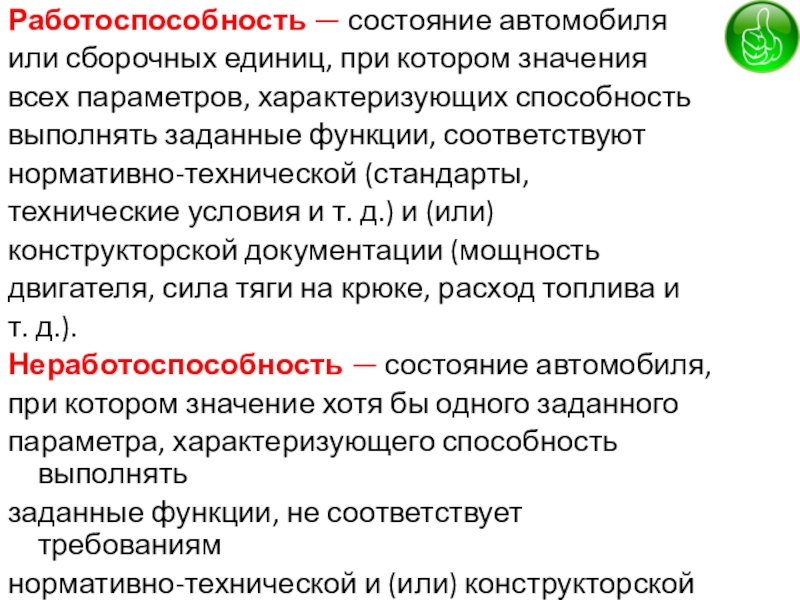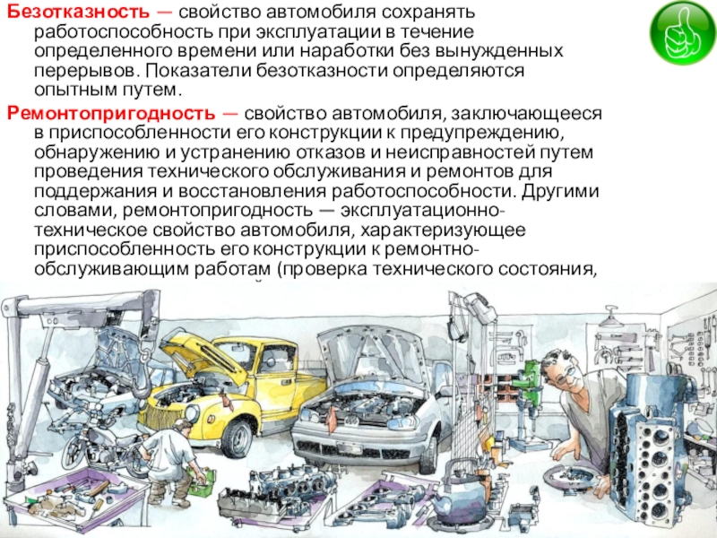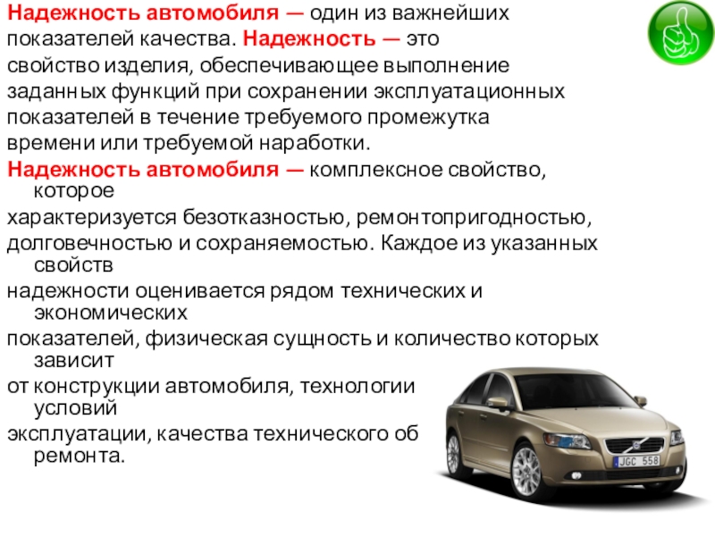 Слайд 13Безотказность — свойство автомобиля сохранять работоспособность при эксплуатации в течение определенного времени