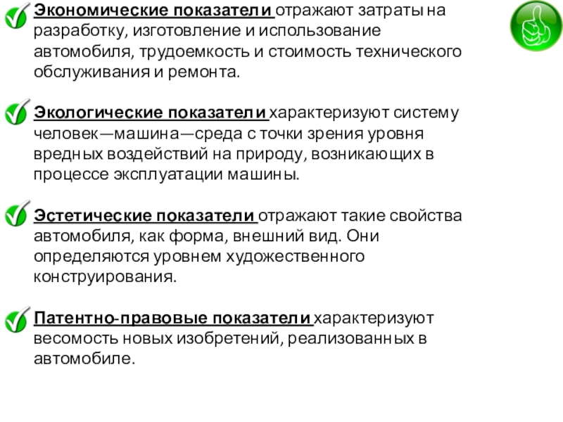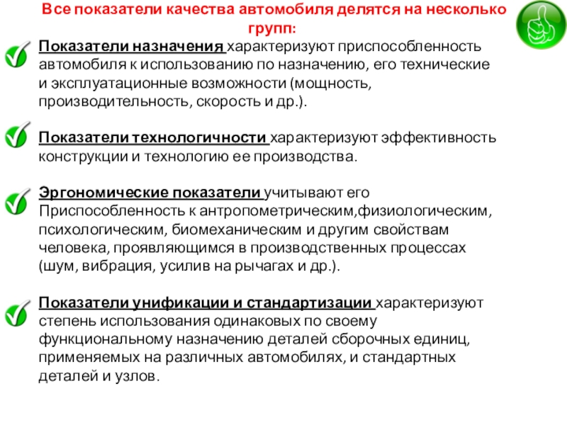 Слайд 5Все показатели качества автомобиля делятся на несколько