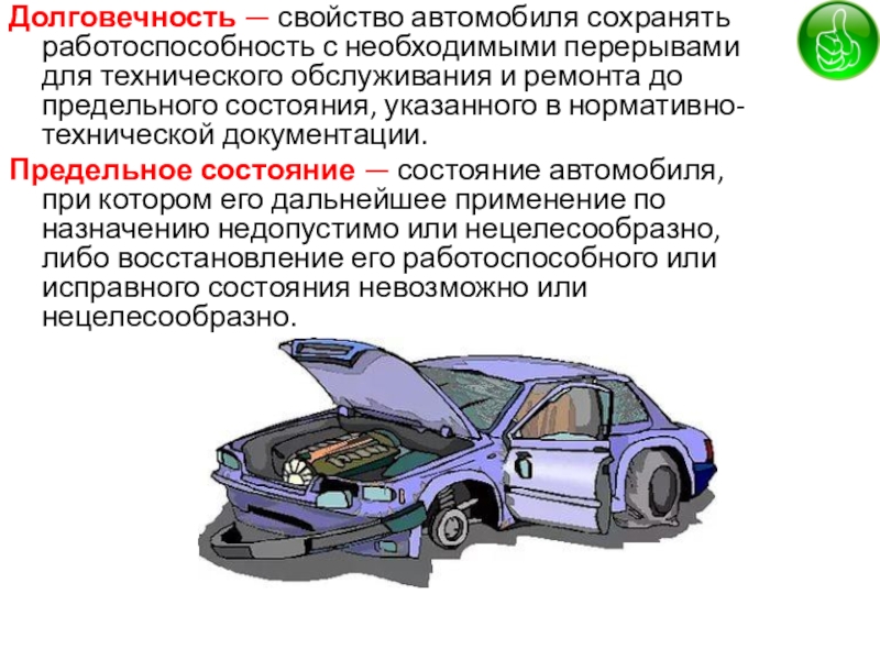 Слайд 14Долговечность — свойство автомобиля сохранять работоспособность с необходимыми перерывами для технического обслуживания