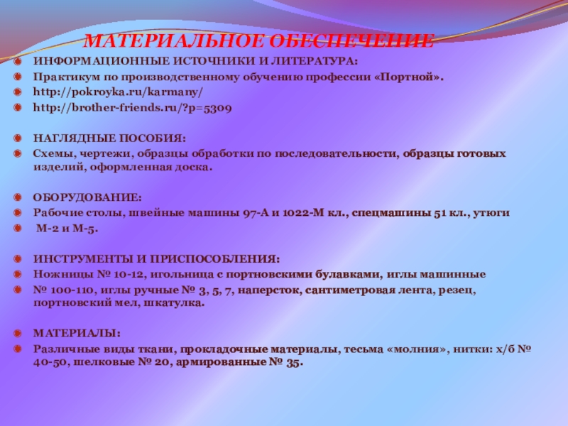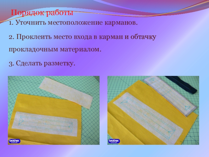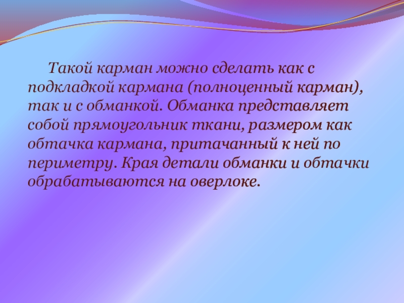 Рекомендовано к использованию на уроках учебной практики в рамках ППКРС по профессии 29.01.05 Закройщик, с целью ознакомления, обучающихся с различными способами обработки накладного кармана - портфель, формирования приемов выполнения обучающимися отдельных узлов; закрепления знаний, полученных на уроках теоретического обучения; развития творческих способностей и познавательной активности обучающихся.