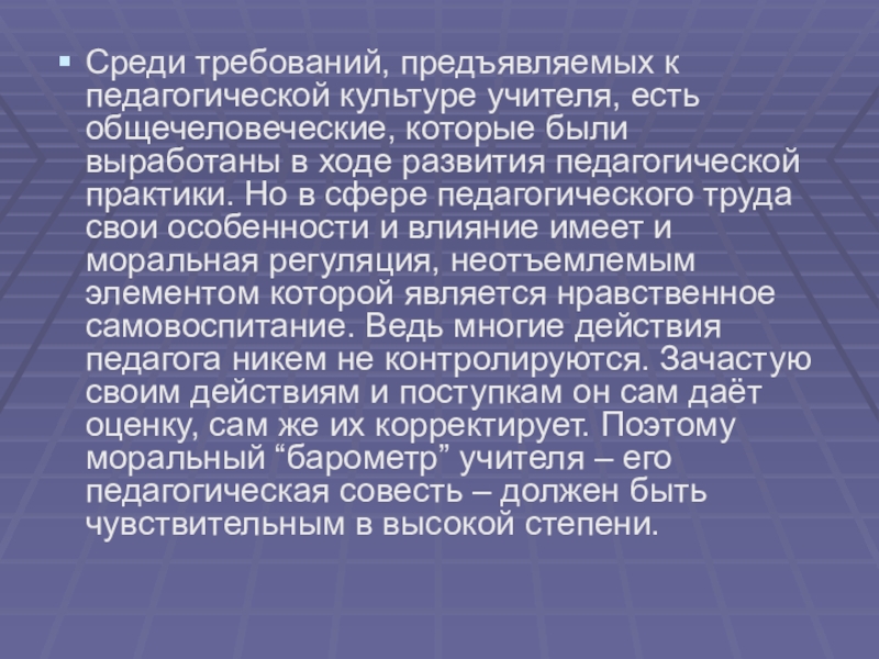Среди требований, предъявляемых к педагогической культуре учителя, есть общечеловеческие, которые были