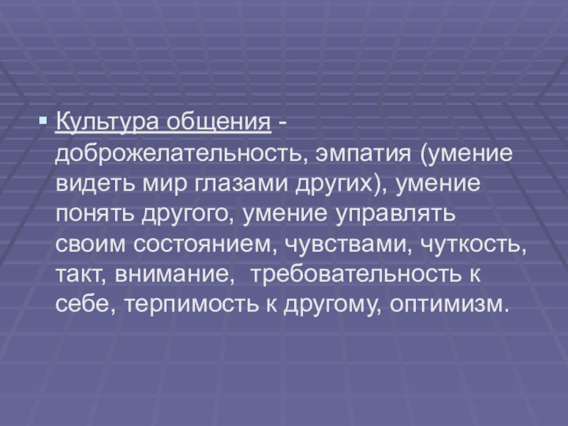 Культура общения - доброжелательность, эмпатия (умение видеть мир глазами других), умение
