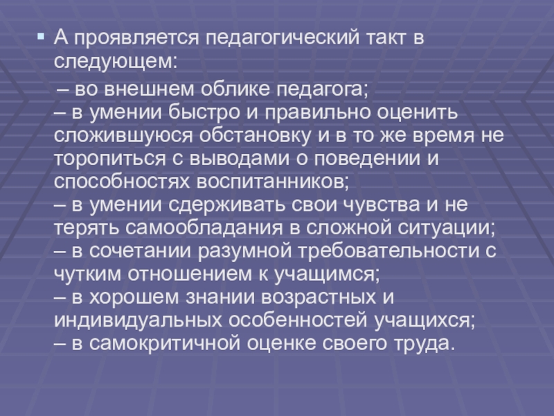 А проявляется педагогический такт в следующем: