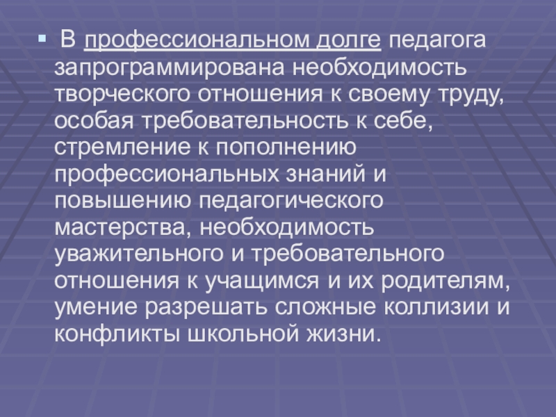 В профессиональном долге педагога запрограммирована необходимость творческого отношения к своему