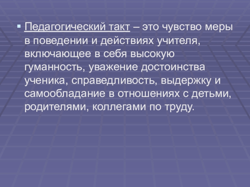 включающее в себя высокую гуманность, уважение достоинства ученика, справедливость, выдержку и самообладание в отношениях с детьми, родителями, коллегами по труду.