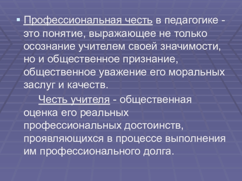 Честь учителя - общественная оценка его реальных профессиональных достоинств, проявляющихся в процессе выполнения им профессионального долга.
