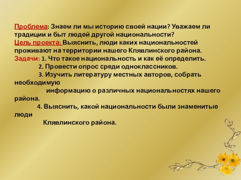 Цель проекта: Выяснить, люди каких национальностей проживают на территории нашего Клявлинского района.