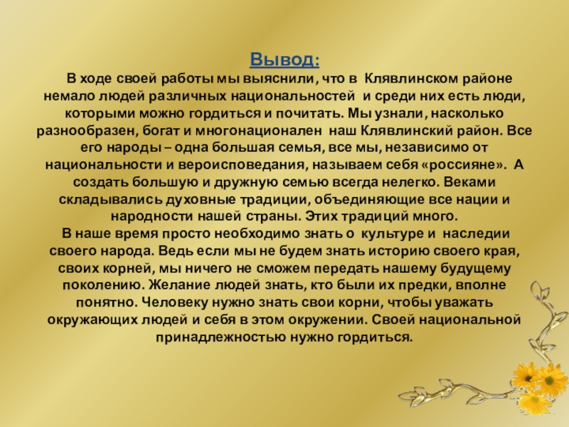 В наше время просто необходимо знать о культуре и наследии своего народа. Ведь если мы не будем знать историю своего края, своих корней, мы ничего не сможем передать нашему будущему поколению. Желание людей знать, кто были их предки, вполне понятно. Человеку нужно знать свои корни, чтобы уважать окружающих людей и себя в этом окружении. Своей национальной принадлежностью нужно гордиться.