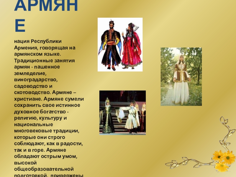 нация Республики Армения, говорящая на армянском языке. Традиционные занятия армян -