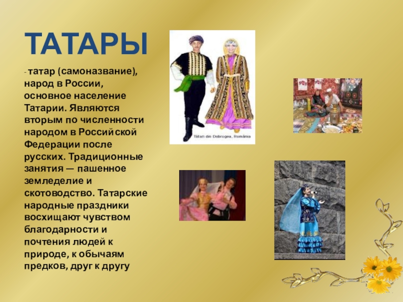 по численности народом в Российской Федерации после русских. Традиционные занятия — пашенное земледелие и скотоводство. Татарские народные праздники восхищают чувством благодарности и почтения людей к природе, к обычаям предков, друг к другу