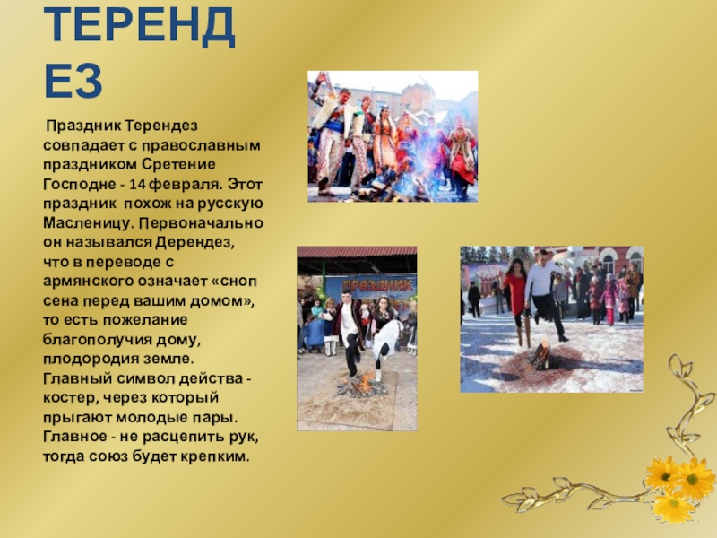 февраля. Этот праздник похож на русскую Масленицу. Первоначально он назывался Дерендез, что в переводе с армянского означает «сноп сена перед вашим домом», то есть пожелание благополучия дому, плодородия земле. Главный символ действа - костер, через который прыгают молодые пары. Главное - не расцепить рук, тогда союз будет крепким.