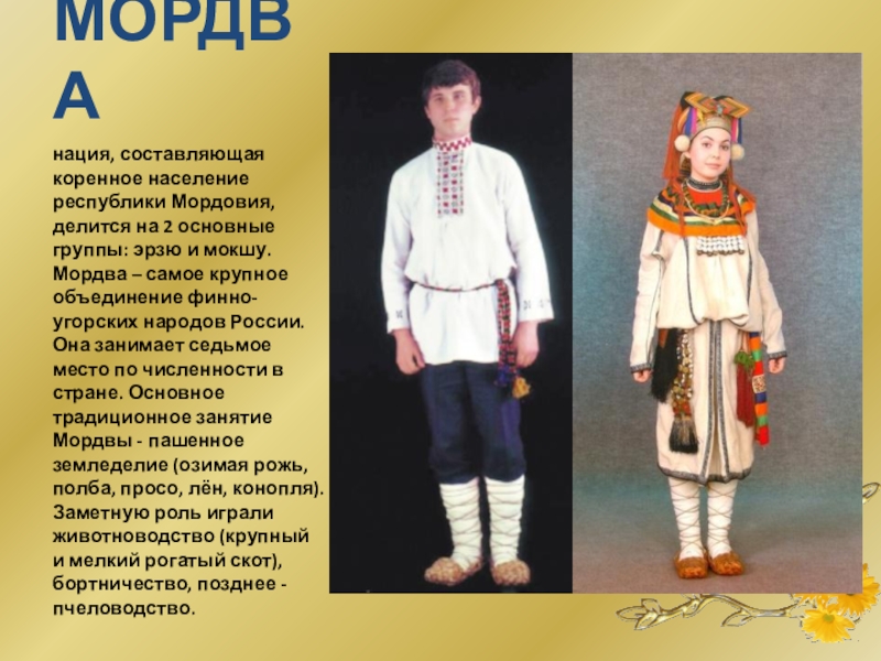 эрзю и мокшу. Мордва – самое крупное объединение финно-угорских народов России. Она занимает седьмое место по численности в стране. Основное традиционное занятие Мордвы - пашенное земледелие (озимая рожь, полба, просо, лён, конопля). Заметную роль играли животноводство (крупный и мелкий рогатый скот), бортничество, позднее - пчеловодство.