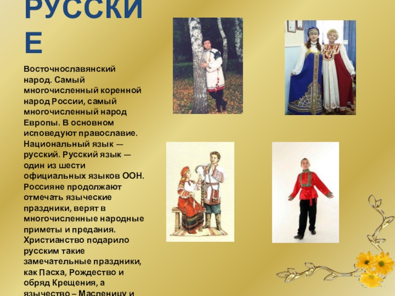 Восточнославянский народ. Самый многочисленный коренной народ России, самый многочисленный народ Европы.