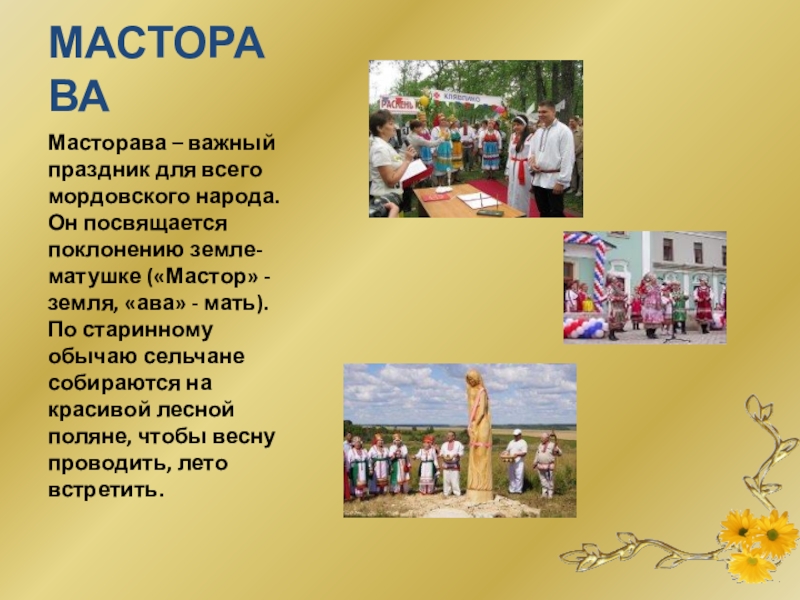 земле-матушке («Мастор» - земля, «ава» - мать). По старинному обычаю сельчане собираются на красивой лесной поляне, чтобы весну проводить, лето встретить.