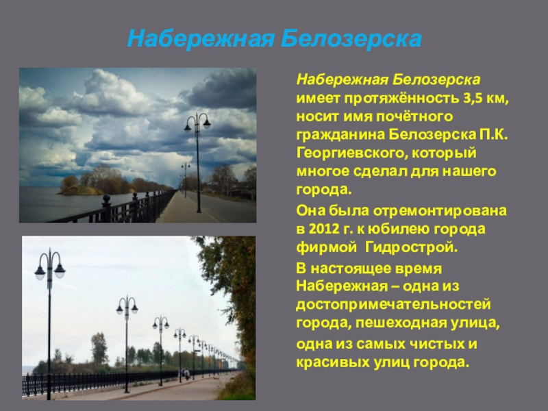 Набережная Белозерска имеет протяжённость 3,5 км, носит имя почётного гражданина