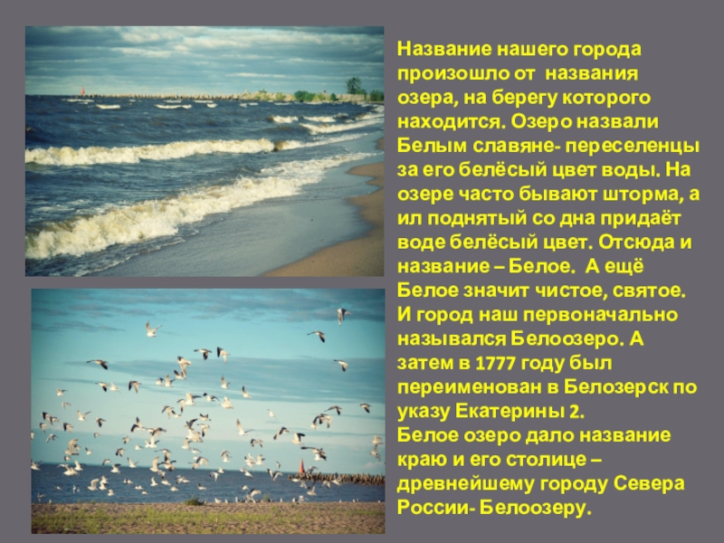 Озеро назвали Белым славяне- переселенцы за его белёсый цвет воды. На озере часто бывают шторма, а ил поднятый со дна придаёт воде белёсый цвет. Отсюда и название – Белое. А ещё Белое значит чистое, святое. И город наш первоначально назывался Белоозеро. А затем в 1777 году был переименован в Белозерск по указу Екатерины 2.