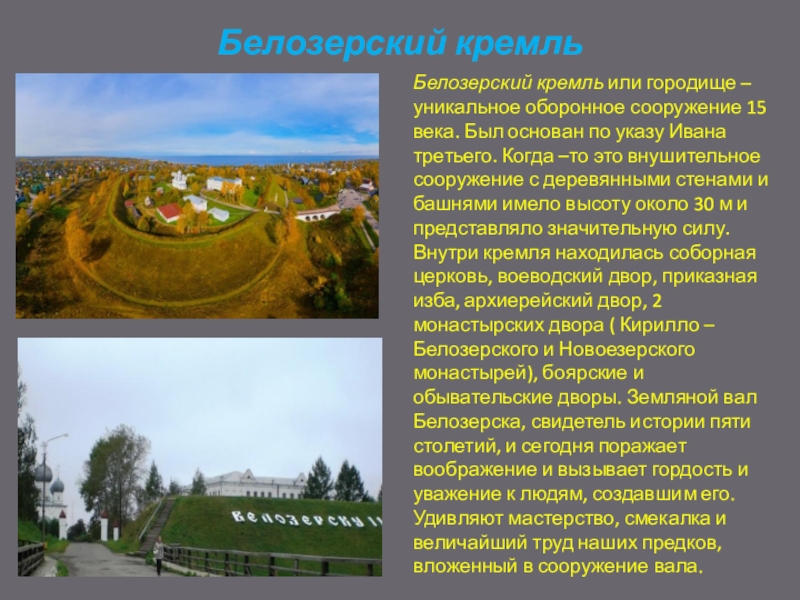 Был основан по указу Ивана третьего. Когда –то это внушительное сооружение с деревянными стенами и башнями имело высоту около 30 м и представляло значительную силу. Внутри кремля находилась соборная церковь, воеводский двор, приказная изба, архиерейский двор, 2 монастырских двора ( Кирилло – Белозерского и Новоезерского монастырей), боярские и обывательские дворы. Земляной вал Белозерска, свидетель истории пяти столетий, и сегодня поражает воображение и вызывает гордость и уважение к людям, создавшим его. Удивляют мастерство, смекалка и величайший труд наших предков, вложенный в сооружение вала.