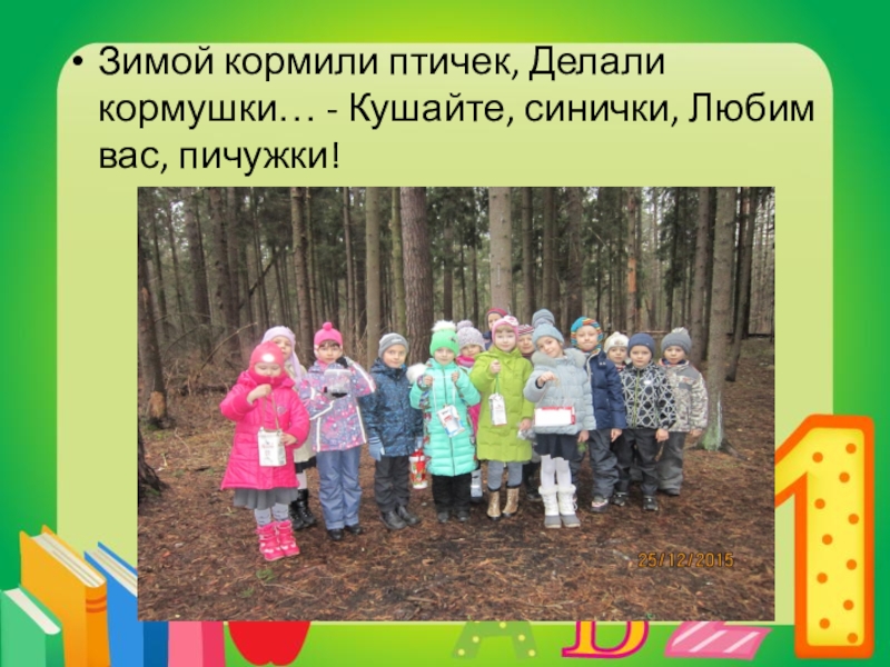 Слайд 18Зимой кормили птичек, Делали кормушки… - Кушайте, синички, Любим вас, пичужки!