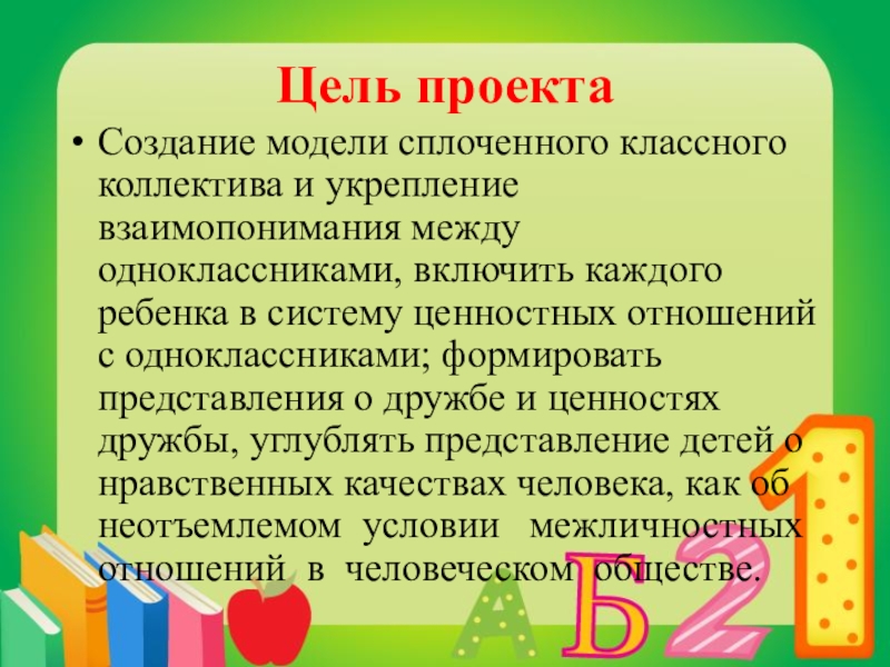 включить каждого ребенка в систему ценностных отношений с одноклассниками; формировать представления о дружбе и ценностях дружбы, углублять представление детей о нравственных качествах человека, как об неотъемлемом условии межличностных отношений в человеческом обществе.