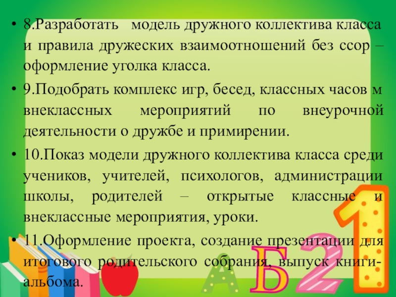 10.Показ модели дружного коллектива класса среди учеников, учителей, психологов, администрации школы, родителей – открытые классные и внеклассные мероприятия, уроки.