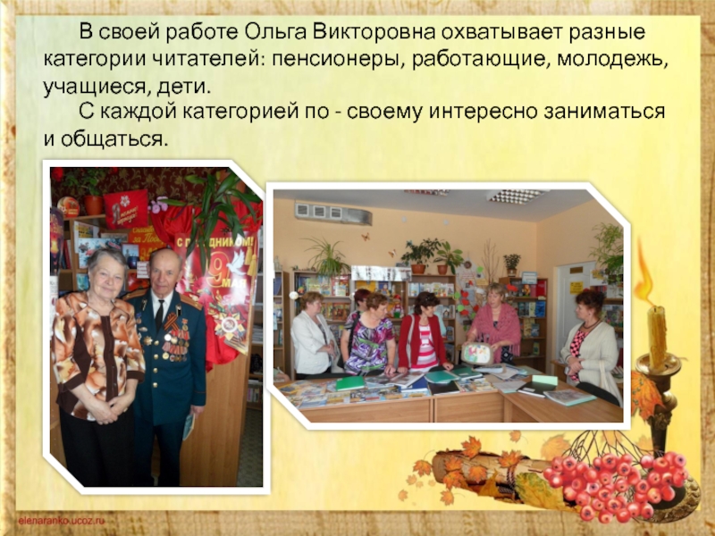 Слайд 9 В своей работе Ольга Викторовна охватывает разные категории читателей: пенсионеры, работающие,