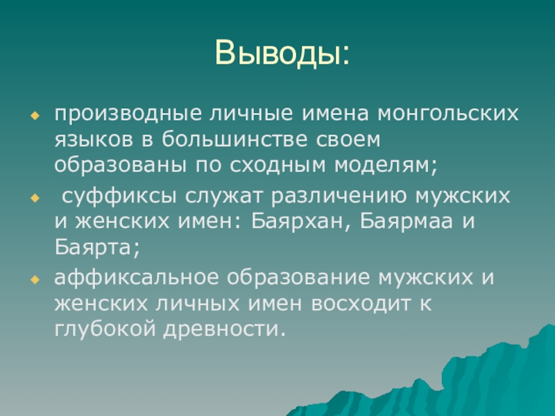 Выводы:производные личные имена монгольских языков в большинстве своем образованы по сходным моделям; суффиксы служат различению мужских и