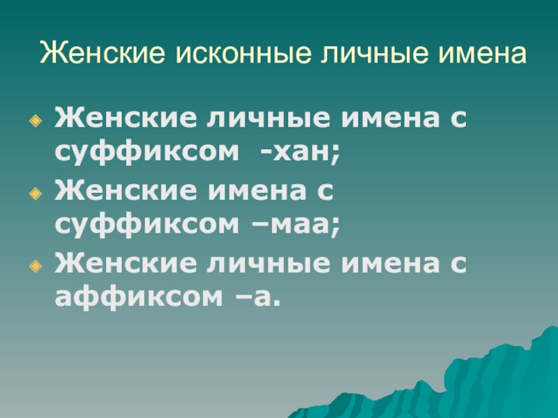 Женские исконные личные именаЖенские личные имена с суффиксом -хан; Женские имена с суффиксом –маа; Женские личные имена
