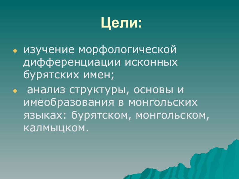 Цели:изучение морфологической дифференциации исконных бурятских имен; анализ структуры, основы и имеобразования в монгольских языках: бурятском, монгольском, калмыцком.