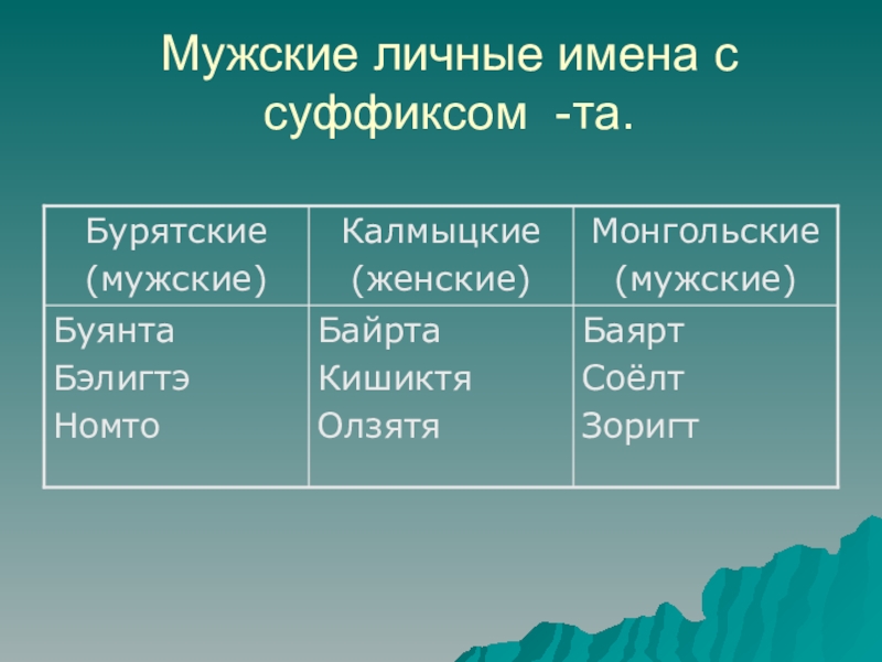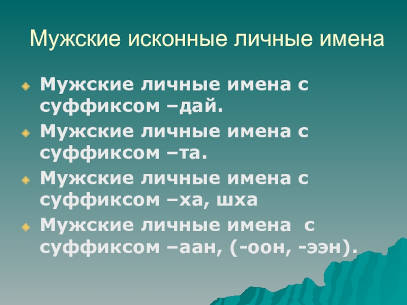 Мужские исконные личные имена Мужские личные имена с суффиксом –дай. Мужские личные имена с суффиксом –та. Мужские