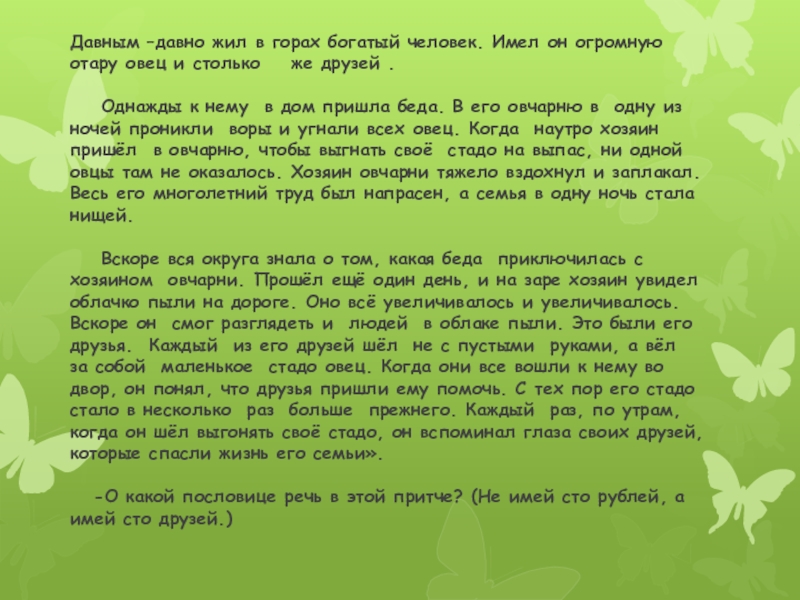 Слайд 2Давным –давно жил в горах богатый человек. Имел он огромную отару