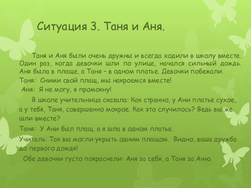 и всегда ходили в школу вместе. Один раз, когда девочки шли по улице, начался сильный дождь. Аня была в плаще, а Таня – в одном платье. Девочки побежали.