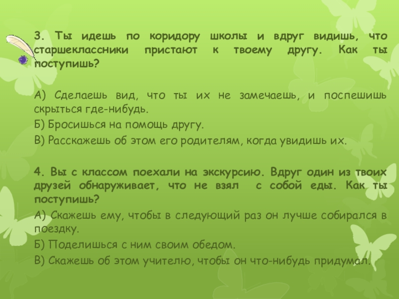 4. Вы с классом поехали на экскурсию. Вдруг один из твоих друзей обнаруживает, что не взял с собой еды. Как ты поступишь?