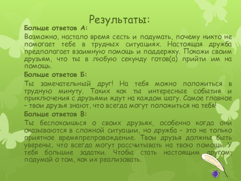 Ты замечательный друг! На тебя можно положиться в трудную минуту. Таких как ты интересные события и приключения с друзьями ждут на каждом шагу. Самое главное – твои друзья знают, что всегда могут положиться на тебя!