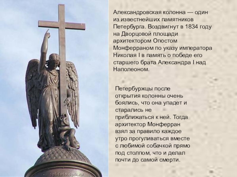 Петербуржцы после открытия колонны очень боялись, что она упадет и старались не приближаться к ней. Тогда архитектор Монферран взял за правило каждое утро прогуливаться вместе с любимой собачкой прямо под столпом, что и делал почти до самой смерти.