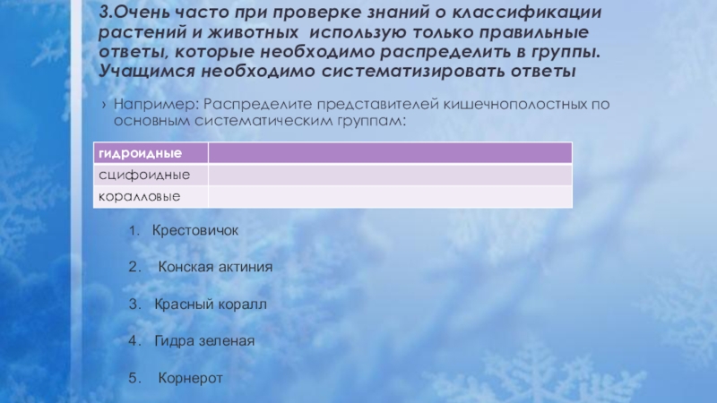 Например: Распределите представителей кишечнополостных по основным систематическим группам: