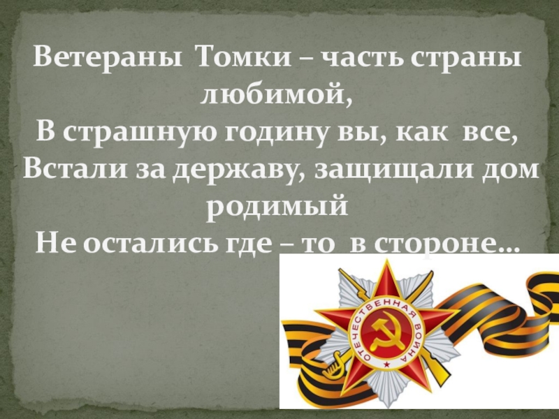 Ветераны Томки – часть страны любимой,В страшную годину вы, как все,Встали за державу, защищали дом родимыйНе остались