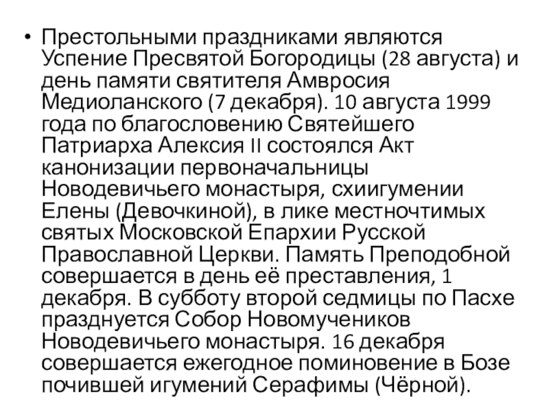 святителя Амвросия Медиоланского (7 декабря). 10 августа 1999 года по благословению Святейшего Патриарха Алексия II состоялся Акт канонизации первоначальницы Новодевичьего монастыря, схиигумении Елены (Девочкиной), в лике местночтимых святых Московской Епархии Русской Православной Церкви. Память Преподобной совершается в день её преставления, 1 декабря. В субботу второй седмицы по Пасхе празднуется Собор Новомучеников Новодевичьего монастыря. 16 декабря совершается ежегодное поминовение в Бозе почившей игумений Серафимы (Чёрной).