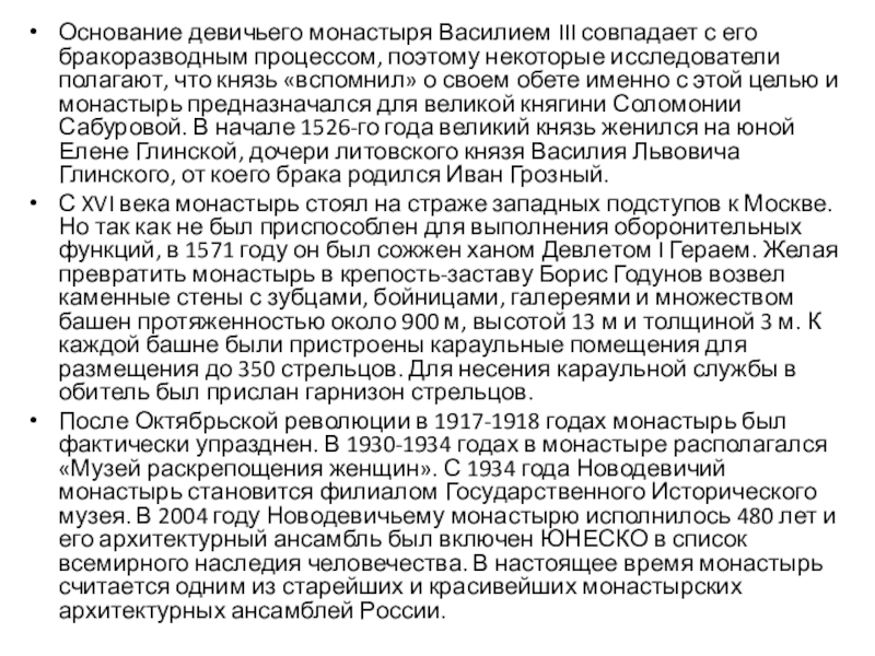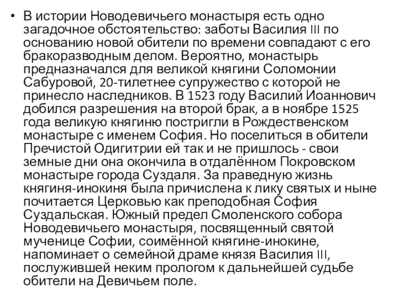 Слайд 13В истории Новодевичьего монастыря есть одно загадочное обстоятельство: заботы Василия III
