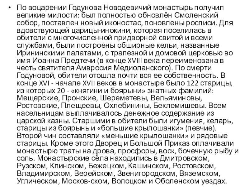 Слайд 14По воцарении Годунова Новодевичий монастырь получил великие милости: был полностью обновлён