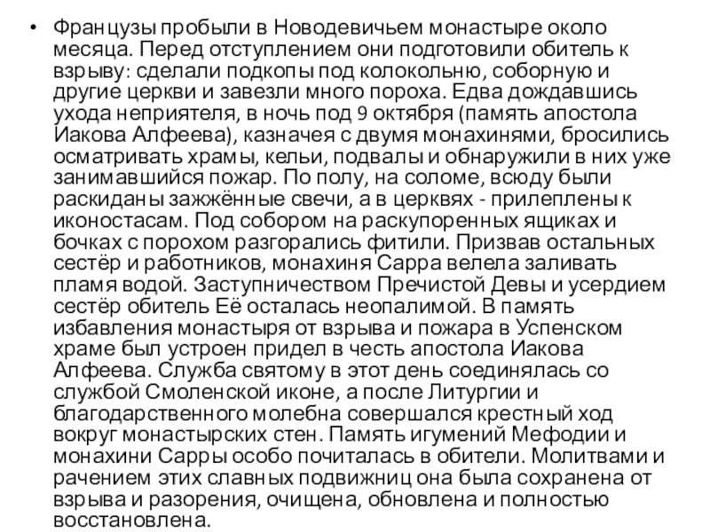 Слайд 28Французы пробыли в Новодевичьем монастыре около месяца. Перед отступлением они подготовили