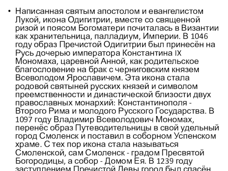 ризой и поясом Богоматери почиталась в Византии как хранительница, палладиум, Империи. В 1046 году образ Пречистой Одигитрии был принесён на Русь дочерью императора Константина IX Мономаха, царевной Анной, как родительское благословение на брак с черниговским князем Всеволодом Ярославичем. Эта икона стала родовой святыней русских князей и символом преемственности и династической близости двух православных монархий: Константинополя - Второго Рима и молодого Русского Государства. В 1097 году Владимир Всеволодович Мономах, перенёс образ Путеводительницы в свой удельный город Смоленск и поставил в соборном Успенском храме. С тех пор икона стала называться Смоленской, сам Смоленск - градом Пресвятой Богородицы, а собор - Домом Ея. В 1239 году заступлением Пречистой Девы город был спасён от нашествия Батыя.