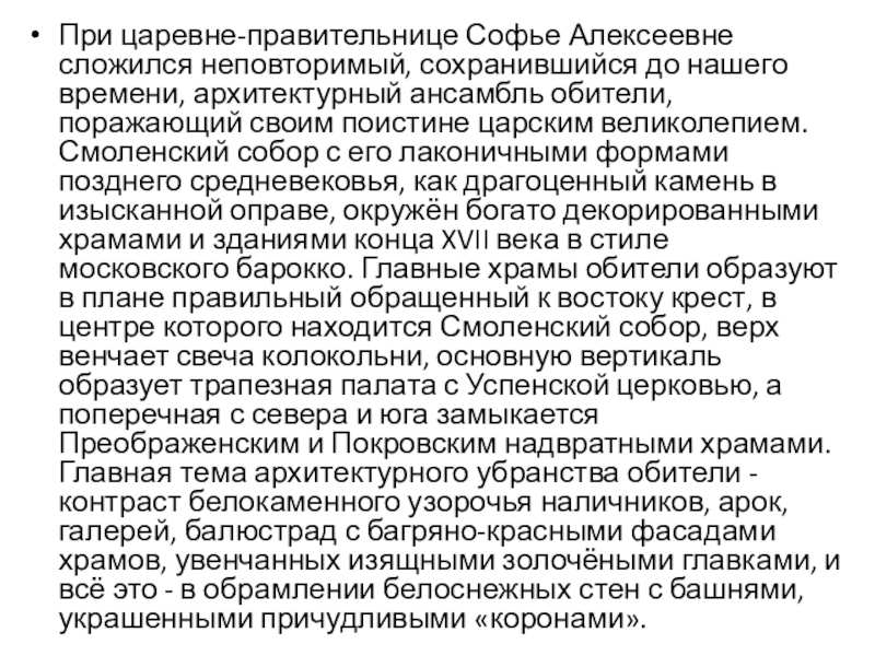 Слайд 21При царевне-правительнице Софье Алексеевне сложился неповторимый, сохранившийся до нашего времени, архитектурный