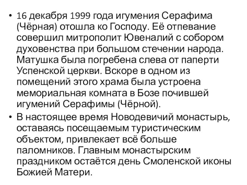 Слайд 3316 декабря 1999 года игумения Серафима (Чёрная) отошла ко Господу. Её