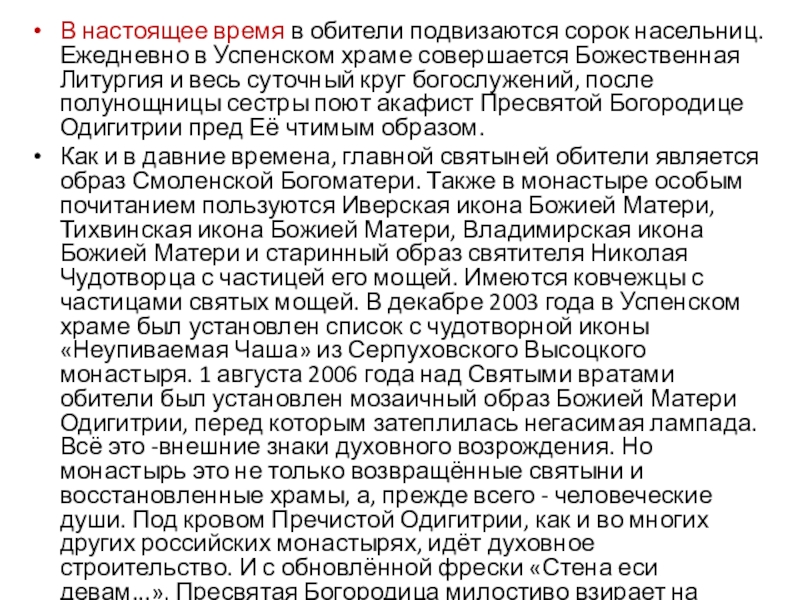 Слайд 35В настоящее время в обители подвизаются сорок насельниц. Ежедневно в Успенском