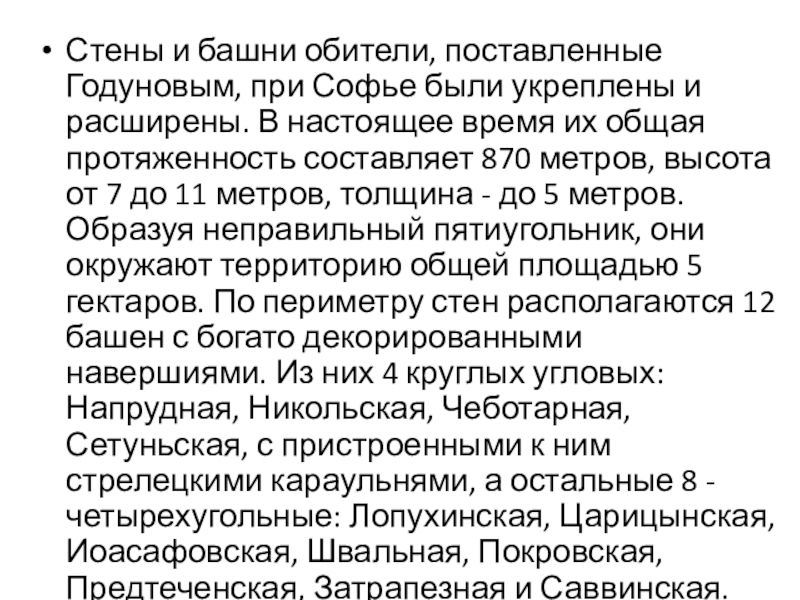 Слайд 22Стены и башни обители, поставленные Годуновым, при Софье были укреплены и