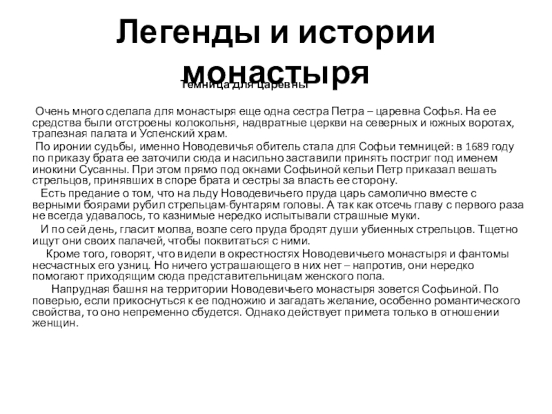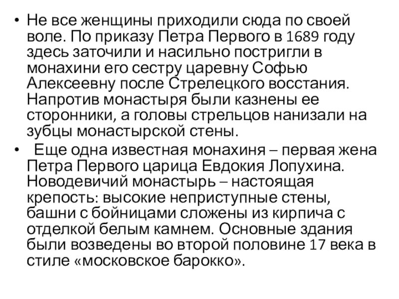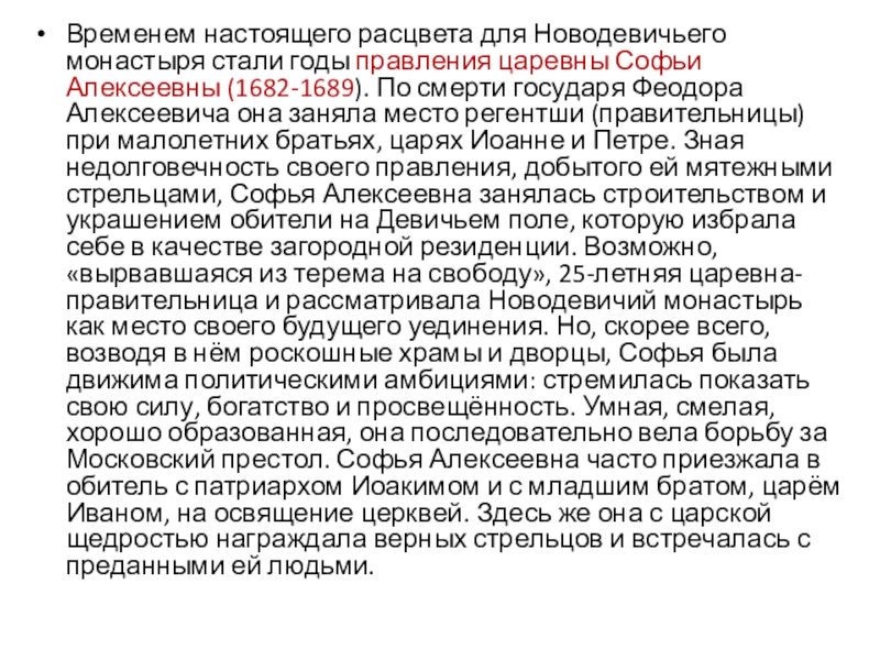 Слайд 20Временем настоящего расцвета для Новодевичьего монастыря стали годы правления царевны Софьи