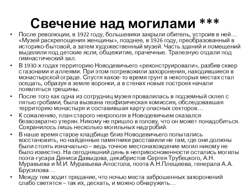 В 1930-х годах территорию Новодевичьего «реконструировали», разбив сквер с газонами и аллеями. При этом потревожили захоронения, находившиеся в монастырской ограде. Спустя какое-то время грунт в некоторых местах стал оседать, образуя в земле воронки, а в стенах новых построек начали появляться трещины.