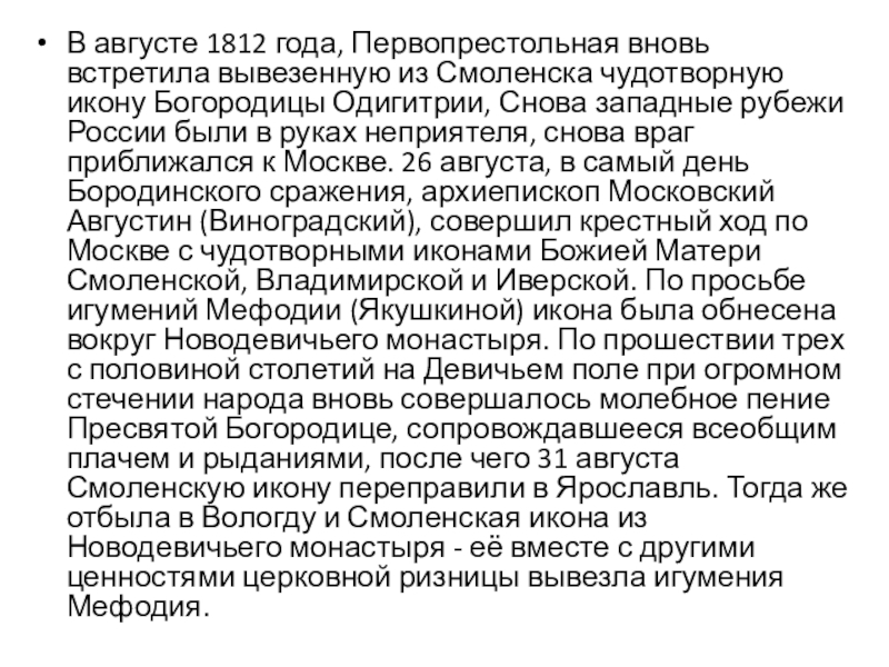 икону Богородицы Одигитрии, Снова западные рубежи России были в руках неприятеля, снова враг приближался к Москве. 26 августа, в самый день Бородинского сражения, архиепископ Московский Августин (Виноградский), совершил крестный ход по Москве с чудотворными иконами Божией Матери Смоленской, Владимирской и Иверской. По просьбе игумений Мефодии (Якушкиной) икона была обнесена вокруг Новодевичьего монастыря. По прошествии трех с половиной столетий на Девичьем поле при огромном стечении народа вновь совершалось молебное пение Пресвятой Богородице, сопровождавшееся всеобщим плачем и рыданиями, после чего 31 августа Смоленскую икону переправили в Ярославль. Тогда же отбыла в Вологду и Смоленская икона из Новодевичьего монастыря - её вместе с другими ценностями церковной ризницы вывезла игумения Мефодия.