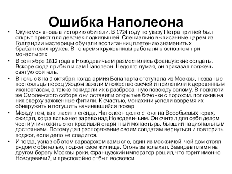 Между тем, как гласит легенда, Наполеон долго стоял на Воробьевых горах, ожидая, когда вспыхнет зарево над Новодевичьим. Он считал для себя делом чести уничтожить этот красивый старинный монастырь, бывший национальным достоянием. Потому дал распоряжение своим солдатам вернуться и повторить поджог, если дело не сладится.