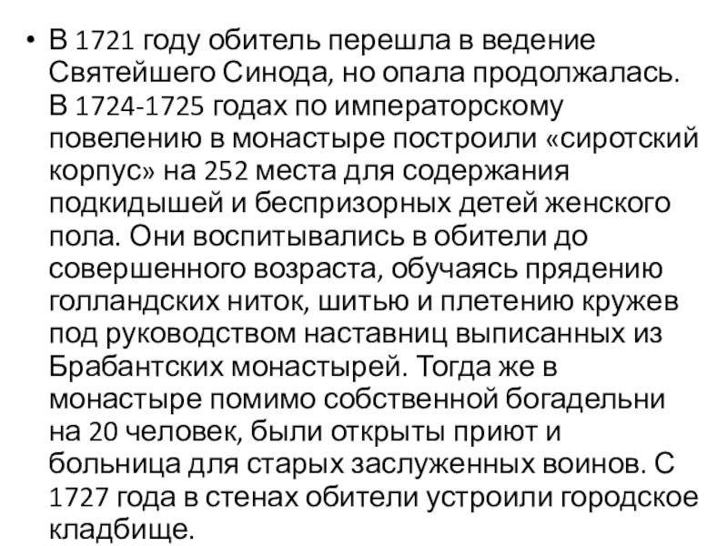 Слайд 23В 1721 году обитель перешла в ведение Святейшего Синода, но опала